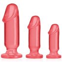Kit de três plugs anais em tamanhos graduais para iniciação da prática anal. Este kit inclui um dildo pequeno apto para iniciantes, um dildo médio para sensações mais fortes, e um dildo grande para jogos mais profundos e intensos. As bases de sucção fixam-se de forma segura quando colocadas sobre uma superfície plana, e todos os plugs são indicados para usar com arnês. Não possui ftalatos, é seguro para a pele e inclui a fórmula antibacteriana Sil-A-Gel.