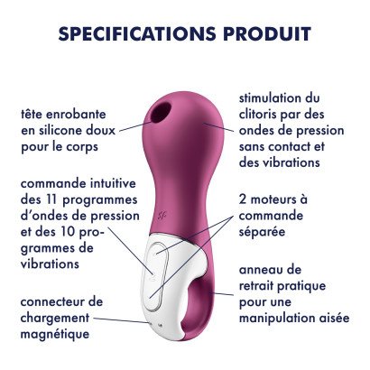 O Satisfyer Lucky Libra abraça o seu clitóris e mima os seus lugares preferidos com ondas de pressão escaldante e vibrações profundas. As 11 intensidades de ondas de pressão e os 10 programas de vibração que podem ser controlados independentemente garantem infinitas combinações possíveis e variedade regular. Para que não se perca nos momentos particularmente arrebatadores, este vibrador está equipado com um anel de retenção prático.