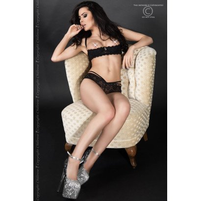Conjunto elegante e surpreendentemente sofisticado. Apresenta meia copa no sutiã, e um romântico coração brilhante entre as copas, o que lhe confere um toque ainda mais irresistível. Possui ainda, uma cueca a combinar com pormenores em renda e tiras em efeito cruzado. É um produto de alta qualidade Chilirose, apresentado numa elegante caixa.