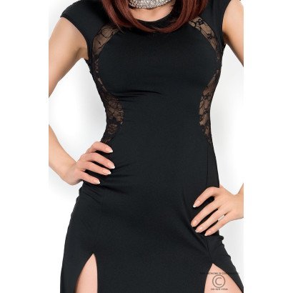 Um vestido preto com encaixes em renda de padrão floral nas costas e na parte lateral. Apresenta duas profundas rachas que deixam as pernas a descoberto.