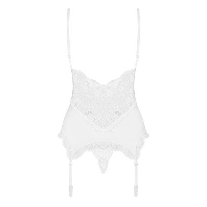 Sinta-se irresistível de forma confortável com este corpete com copas almofadadas, tanga e cinto de ligas. O seu corte faz com que abrace as suas curvas vertiginosamente e a renda trabalhada dá um toque de ousadia.